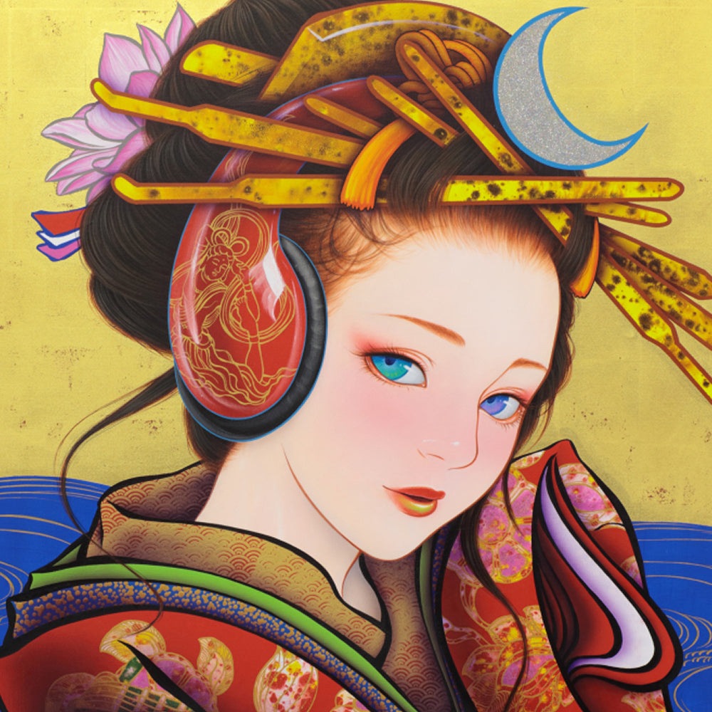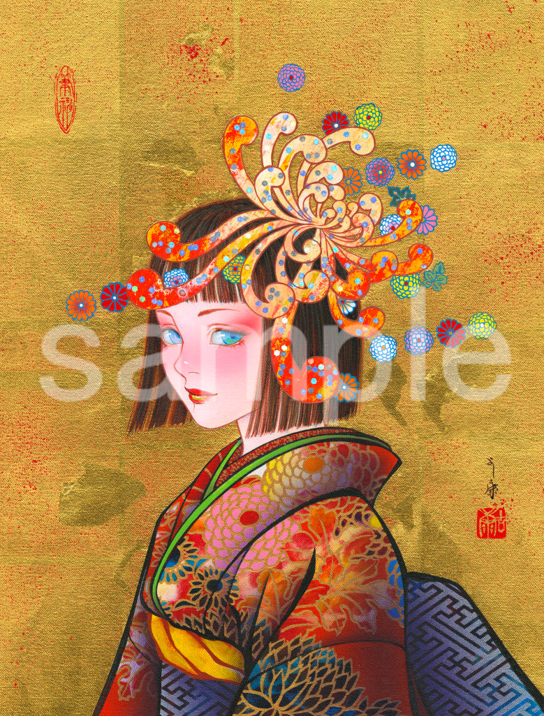 おかっぱ頭の少女は、花魁や一人前の女性になる前の「禿」であることを表していますが、その頭から菊が大きく咲くことで、菊理姫のような能力を将来開花させる様子を描きました。