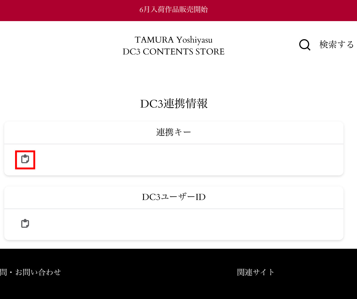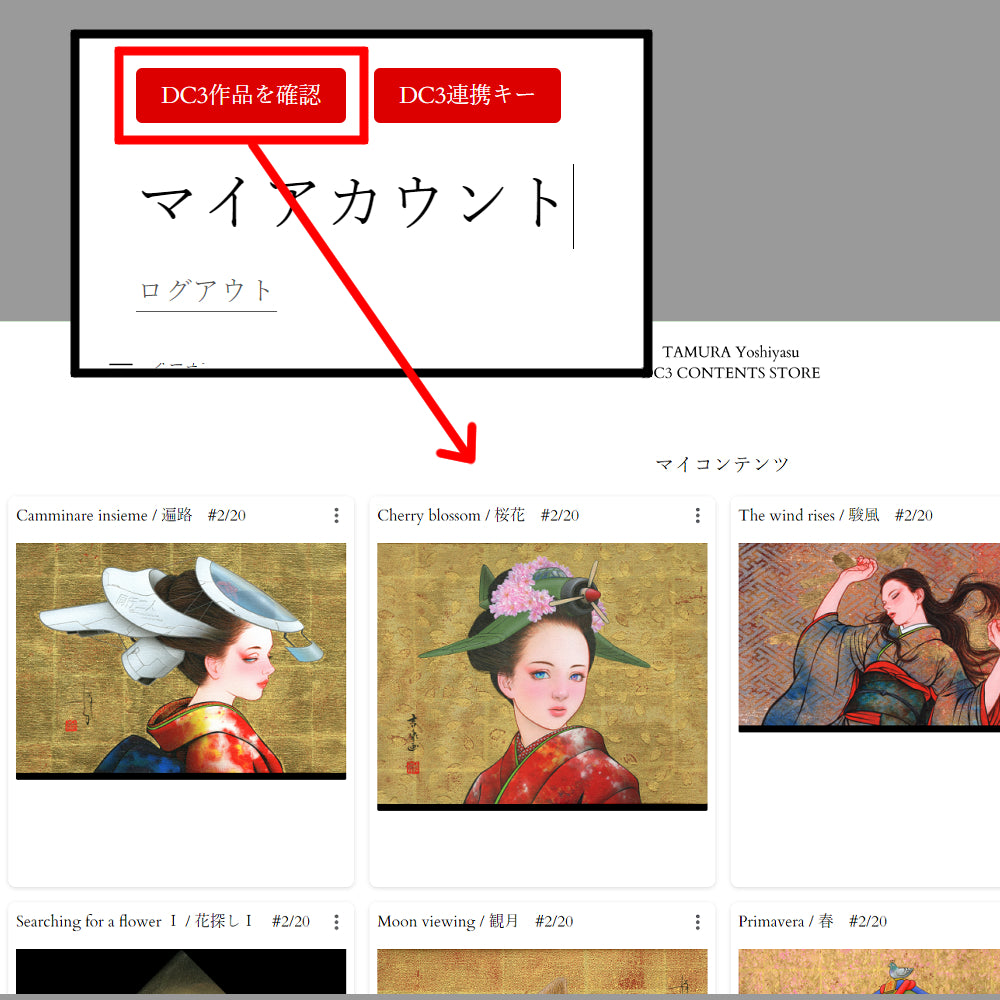 マイアカウントページにて[DC3作品を確認]ボタンを押下すると、お客様がTAMURA Yoshiyasu DC3 CONTENTS STOREで入手したコンテンツの一覧が表示されます。
