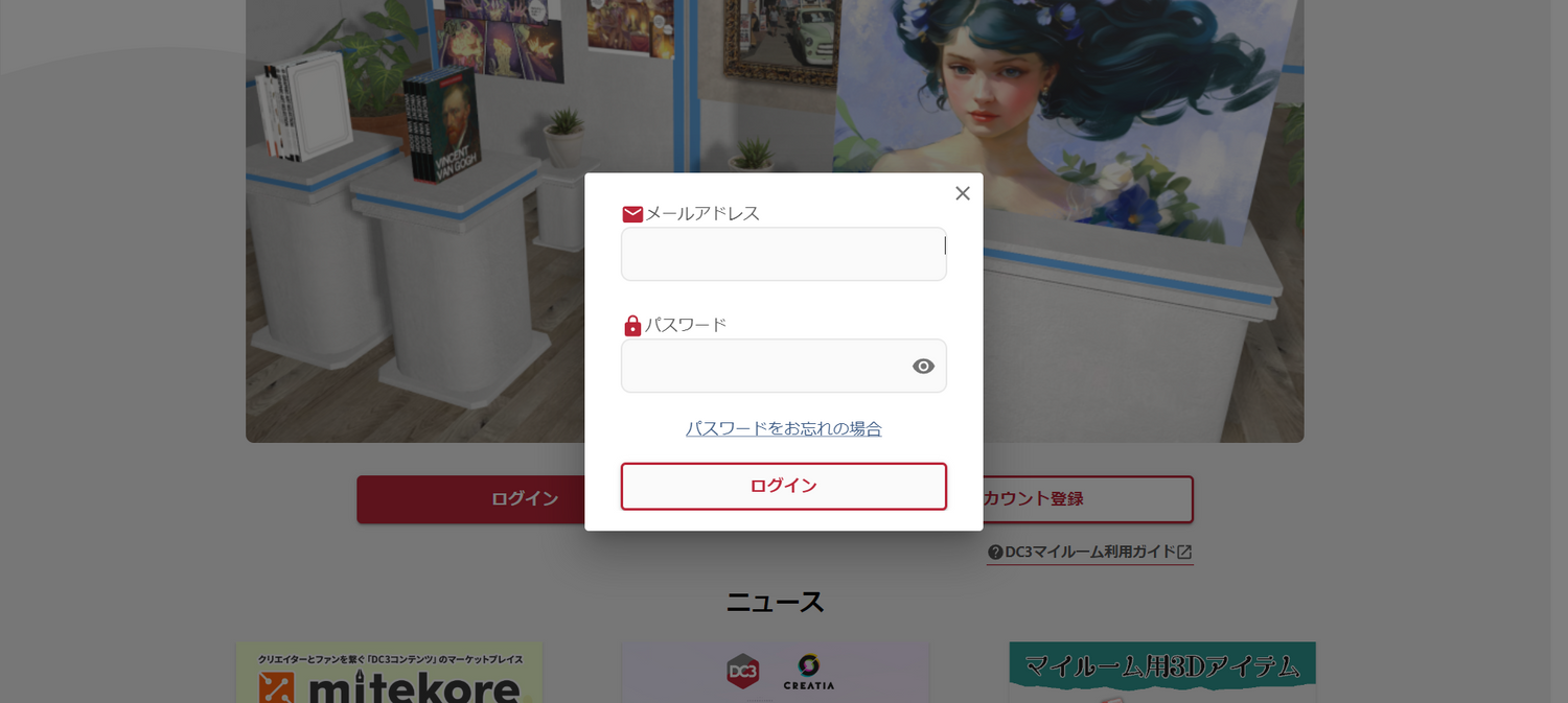 さらにDC3マイルームでサービス連携設定を行うことで、TAMURA Yoshiyasu CONTENTS STOREで取得したDC3コンテンツをDC3マイルームの3D空間上に飾ることが出来ます。